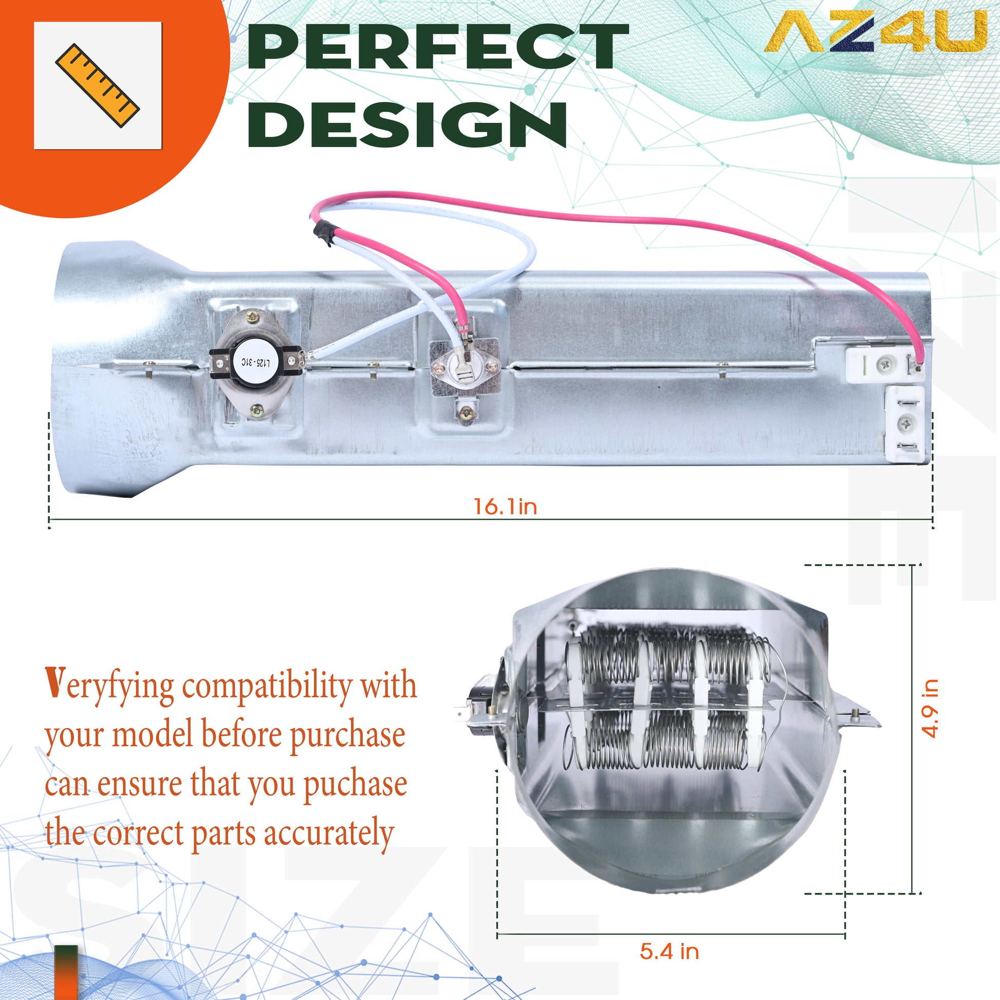 - Package included: Dryer Heating Element Assembly as the picture. The dryer heating element is made of high quality metal, contains nickel-chromium content up to 85% heating coil, can effectively heat in the electric dryer. Material: Metal / Ceramic. Electrical Specs: 240V, 5400W