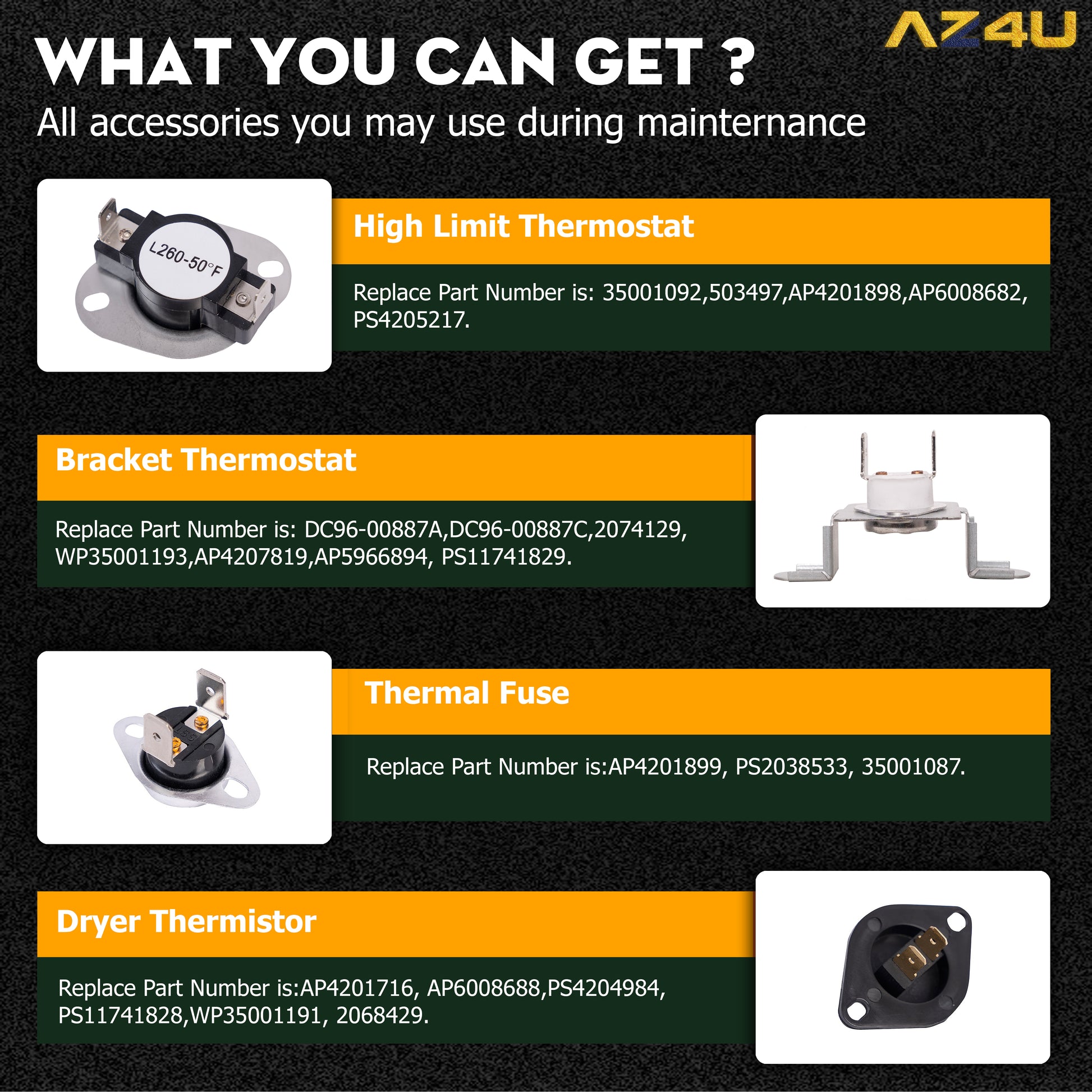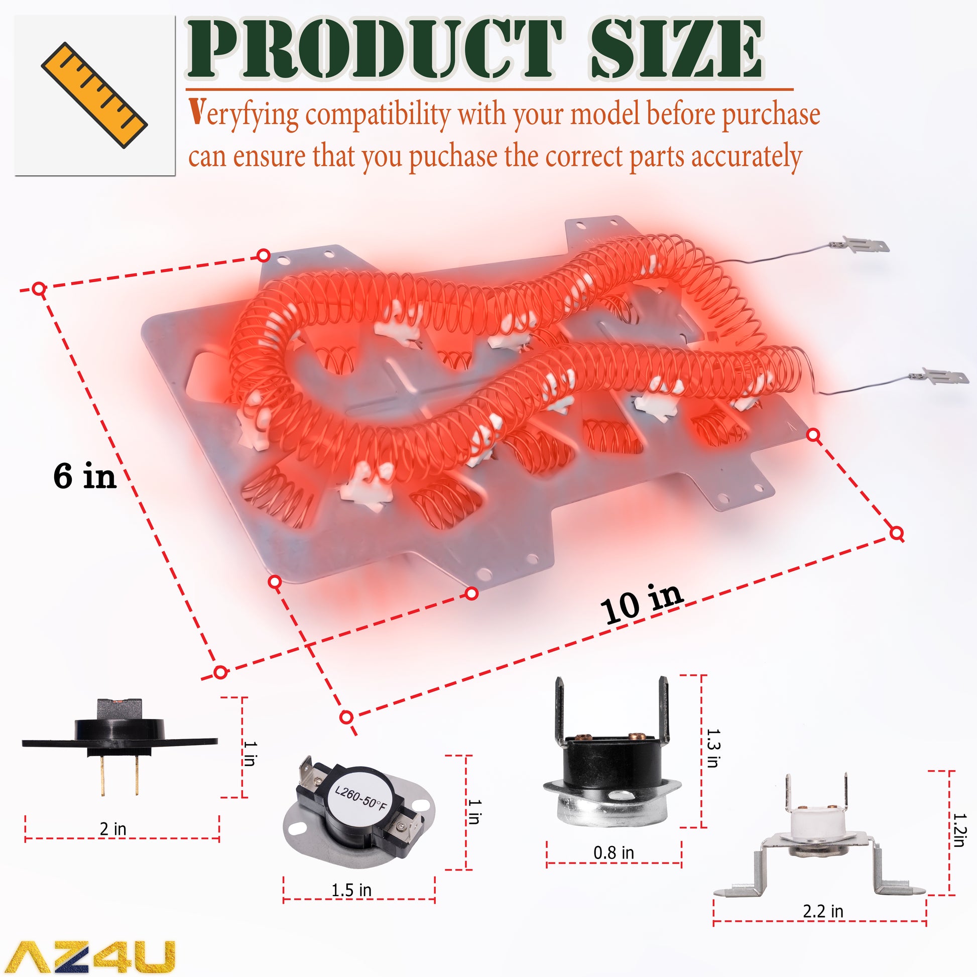 - Package included: All Dryer Heating Element and thermal fuse as the picture. ( Dryer heating element, high limit thermal fuse, thermal fuse Thermostat, High Limit thermistor)